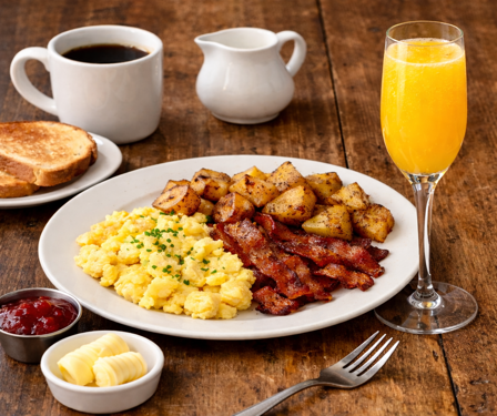 3 eggs scrambled with smoked ham, bacon, shredded cheese, peppers, onions, served with breakfast potatoes and choice of toast